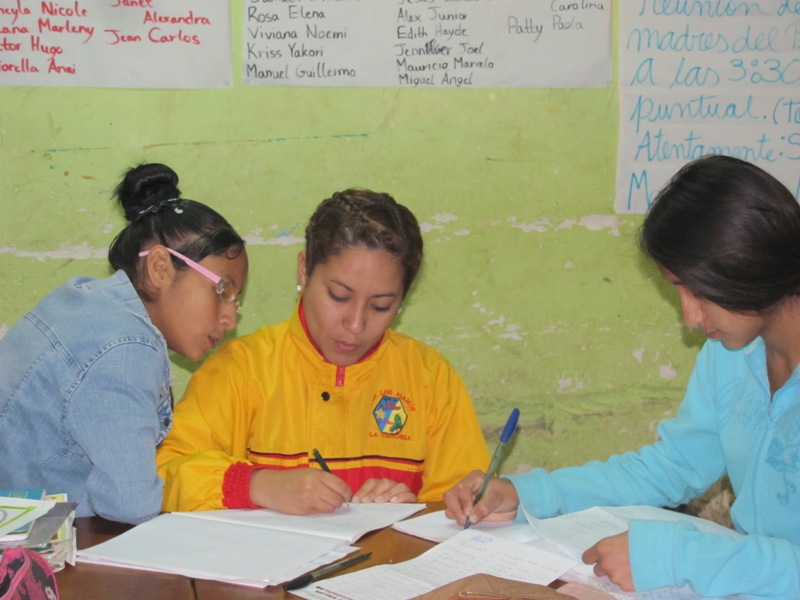 Below is my lovely co-teacher, Bety, an elementary/high school math teacher working with Centro Esperanza for almost three years now. I took this picture during the homework help session with the older students on Monday morning; Bety is helping Janet, on the left, and Isabella, on the right.