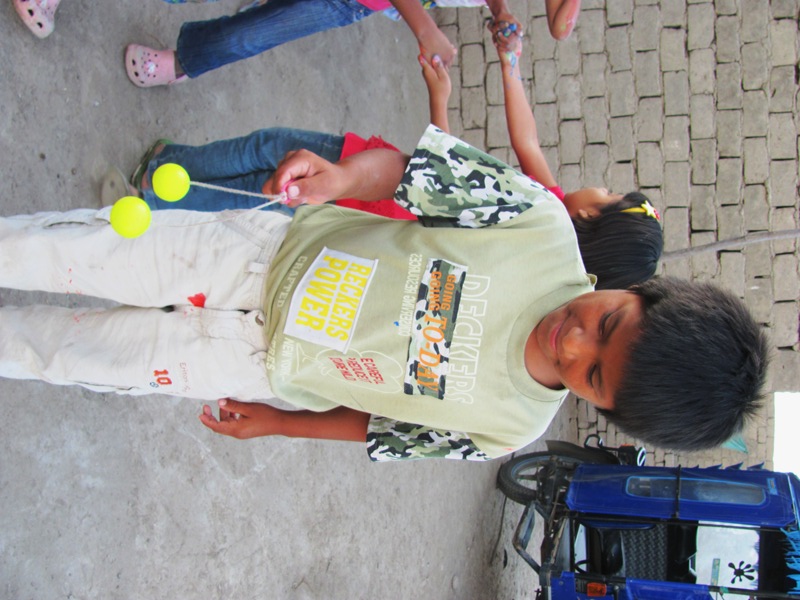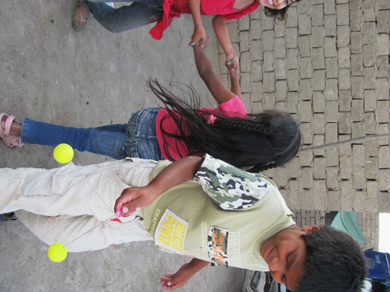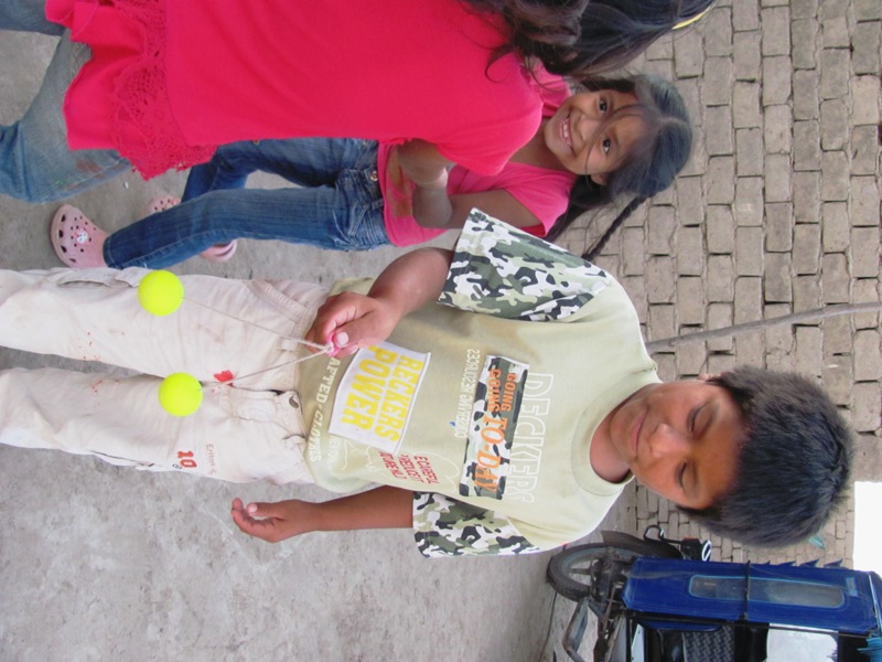As summer is approaching, there is more light in the afternoon, so we decided to stay for a bit of play time after the snack. Below is Eber with a “taka taka”, a common toy here. The idea is to use a precise movement so the balls bounce off one another and eventually spin up to bounce off each other in a vertical position. It requires a steady hand and a lot of concentration!
