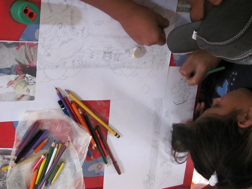 Jean Carlos using the technique of grid drawing I taught him to draw a pig I photographed at La Ladrillera.