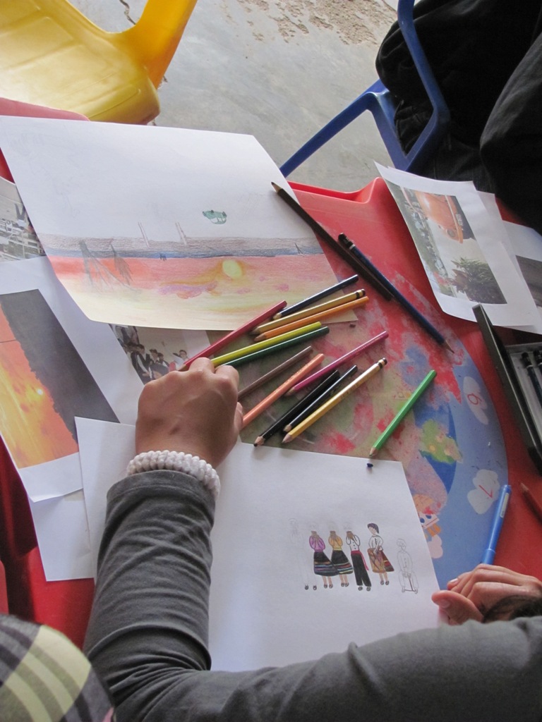 At the second drawing session in Raimondi on Tuesday some fantastic drawings were begun, inspired by photos of local scenes and locals postcards I had brought in, plus some books the participants brought in (although I was hoping they would bring in things or photos to draw and only use mine as extra if needed).