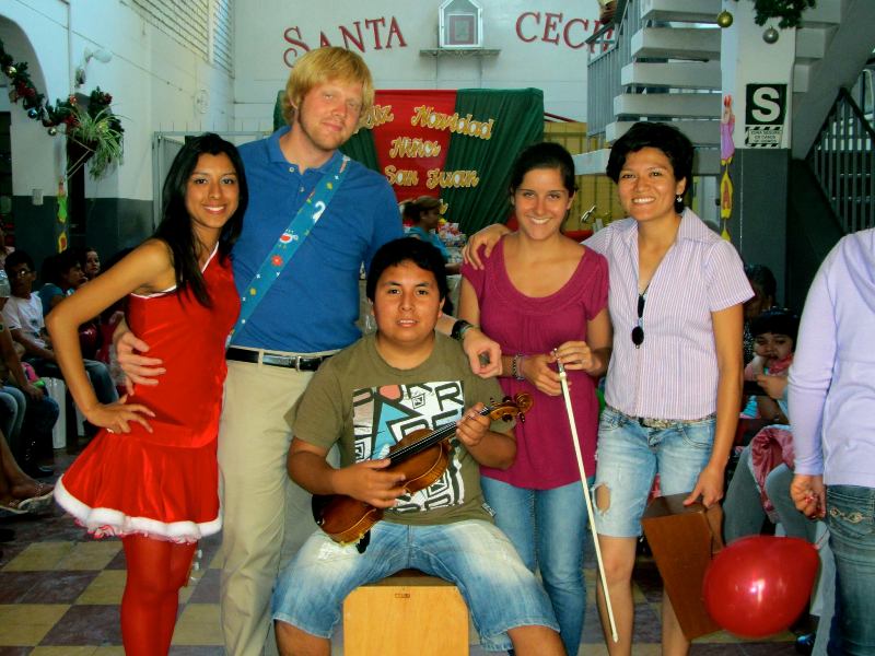 La última vez que toqué con cantautor y guitarrista Zack (aquí en el Cuerpo de Paz de E.E.U.U.) y Xhio (una chiclayana que toca el cajón, a mi derecha). Esos excelentes músicos y yo compartimos muchos momentos musicales memorables en nuestra pequeña banda empezando en octubre (y hasta grabamos un disco de cinco canciones). Esto fue después de tocar en una ‘chocolatada’ (fiesta peruana navideña) para niñ@s con discapacidades, como Michael. 🙂