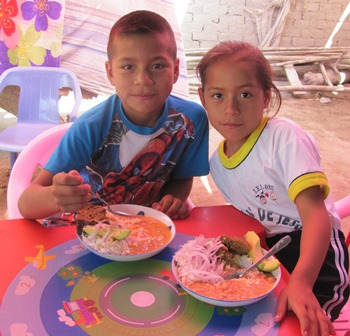 …and began with a delicious meal of goat, rice and beans, with a salad of onions and avocado. The mothers of the children who partake in the program are responsible for buying the ingredients, deciding the menu and cooking on a rotating basis. The program has reduced the prevalence of anemia.