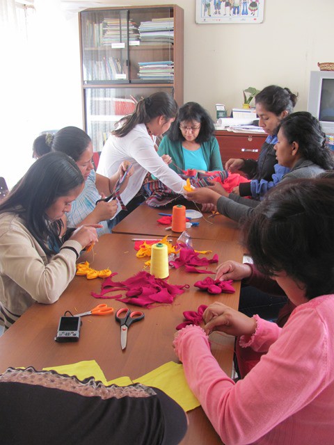 Above, members of ‘Artesanas por la Vida ‘ had a first try at hand-sewing decorative flowers with vibrant Peruvian fabrics on a sunny Saturday morning at the Centro Esperanza (Hope Centre) office. We are still improving designs and experimenting with different materials.