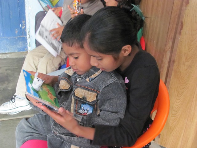This little girl in Puerto Eten this afternoon was reading a book on her own, but became more interested in helping her neighbour read ‘The Very Hungry Caterpillar’ by Eric Carle when she realized he didn’t yet know how to read. It takes a lot for a children’s book to be attractive to a child: besides the text itself, it must have meaningful illustrations (preferably brightly coloured), effective formatting, and of course, an original title never hurts.
