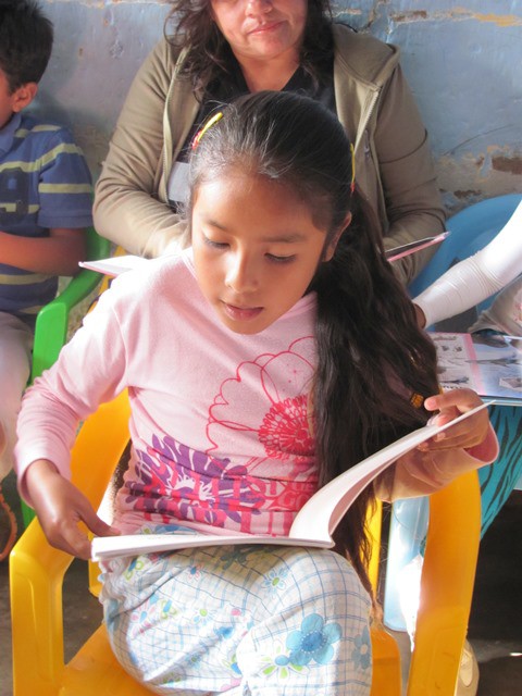 A brother reads to his younger sister who is just beginning to learn how to read in Nuevo San Lorenzo.