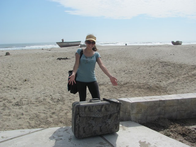 …meet the travelling suitcase that La Cometa Lectora moves around in. This afternoon, my helper Sylvia and I figured it wouldn’t hurt to take La Cometa just one block past the street where the educational program in Puerto Eten takes place…to the Pacific Ocean! ‘The travelling suitcase’ was a contender for a name for the library, but we didn’t want our program to sound like the names of any others and realized that a kite evokes some of what we want to promote with this program (namely, dreaming: of new possibilities, goals, realities, etc.). The kids of Puerto Eten are already planning on making they own kites to fly at the beach to celebrate La Cometa Lectora–I can’t wait to hear about it!