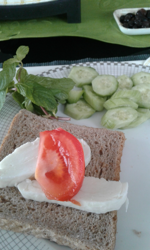 Breakfast: Mmmmmm….Halloumi cheese and tomato on bread, with cucumber, fresh basil (and olives)